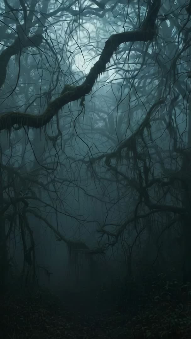 - Moonlit Mist Forest with Tangled Vines and Gnarled Branches — Vertical Atmospheric Footage