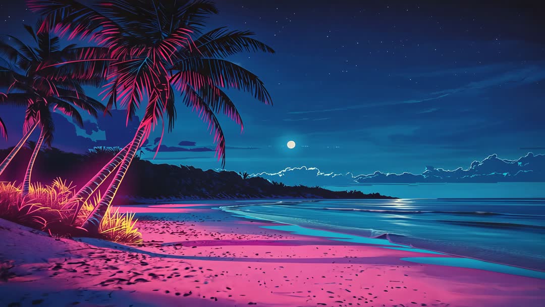 AI Generated Video. Video showing swaying palm cluster casting magenta uplight across pink sand, moonlight reflecting on calm surf, and distant starlit sky. Colors leaning neon cyan and hot pink, creating retro synthwave mood and dreamy coastal atmosphere. Suitable for music video backdrops, social media reels, travel resort promotions, meditation and relaxation apps, website hero loops, and branded commercials. Use for mood-setting overlays, looping backgrounds, title sequences, and album visuals. Suggest adding ambient synth soundtrack, slow camera pan or subtle parallax for extra motion, and soft film grain for cinematic feel. Provide 10-30 second loopable clip with wide right-side copy space for text or logo placement.
