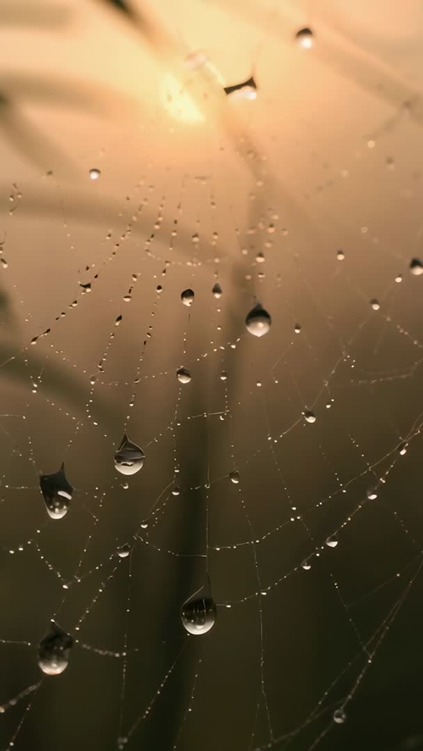 AI Generated Image. Capturing closeup movement of dew-laden spider silk threads collecting droplets in soft golden backlight. Showing delicate water beads forming on intricate web, gently oscillating as sun warms misty garden edge. Creating dreamy, meditative mood with shallow depth of field and strong bokeh highlights, ideal for cutaway or background footage. Working perfectly for nature sequences, wellness and mindfulness apps, slow-motion reels, gardening or outdoor lifestyle promotions, seasonal spring campaigns and editorial visuals. Providing vertical orientation and macro detail for social media stories, mobile ads and cinematic overlays, offering loop-friendly composition and color-grading flexibility.