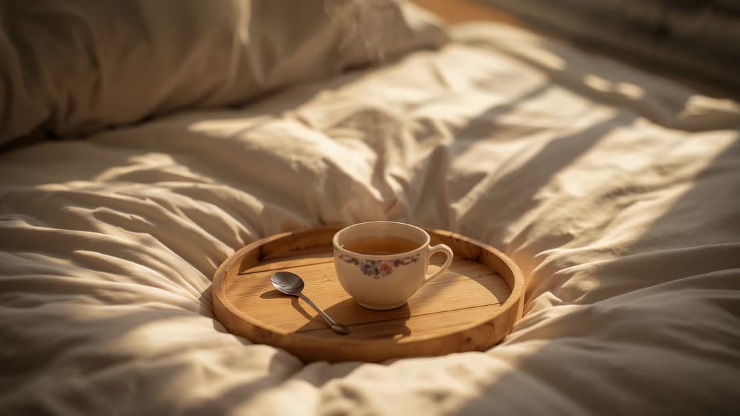 AI Generated Image. Video clip showing morning sunlight pouring over crumpled linen bedding, wooden tray holding steaming floral teacup and teaspoon, soft blinds shadows crossing frame. Composition focusing on center tray with shallow depth of field, warm golden tones creating cozy atmosphere. Footage suiting lifestyle, hospitality, wellness, interior design, breakfast in bed and morning routine content. Suiting website hero, social media reel, promotional ad for tea or bedding brands, blog header, product showcase and mood-setting B-roll. Editing suggestions: applying subtle slow zoom, gentle color boost, soft vignette and loop for seamless background playback, leaving room at right for overlay text or logo. Offering 6–12 seconds loop clip or extended 20–30 seconds version for commercial spots and social ads.