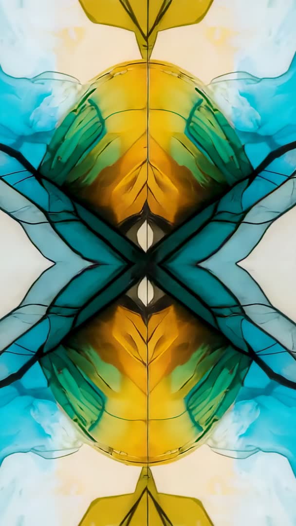 AI Generated Image. Animating vertical kaleidoscopic sequence, morphing symmetrical inkblot and stained-glass patterns across tall canvas while revealing pale luminous core along central seam. Featuring turquoise and amber color palette, fluid vein-like lines, and mirrored X-shaped composition for strong central focus. Designing for loopable playback and seamless looping; recommending export as high-frame-rate MP4 or GIF for smooth morph transitions. Using for Instagram Reels, TikTok, Stories, app hero banners, music visualizers, VJ sets, event projection, meditation app backdrops, editorial covers, and website hero sections. Leaving central seam area clear for vertical typography or logo reveal; suggesting light sans-serif fonts and minimal overlays for maximum contrast. Offering color grading and speed control for mood adjustment; recommending vertical aspect ratio 9:16 and safe zones near top and bottom for captions.