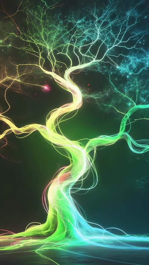 AI Generated Image. Featuring morphing neon tree flowing through spectrum of colors, emitting luminescent ribbons and drifting particles against cosmic void. Vertical format optimizing for mobile platforms, social stories, and short-form video ads. Loopable composition offering seamless color transitions and slow-motion flow for ambient backgrounds, music visualizers, meditation apps, and mood-driven brand content. Suitable for title sequences, sci-fi intros, technology campaigns, live VJ sets, stage visuals, and phone wallpapers. Color palette ranging from electric green to deep blue and magenta, creating vibrant contrast on dark backdrop. Allowing overlay of text, logo reveal, or soundtrack for custom branding and promotional use.