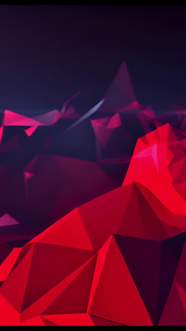 AI Generated Image. Vertical looping video showing morphing red polygon peaks forming abstract 3D landscape inside deep void. Low-poly facets pulsing and shifting smoothly while subtle lighting and layered depth building sense of motion and scale. High-contrast red and magenta tones against deep indigo backdrop delivering dramatic futuristic mood. Ideal for mobile-first projects and vertical formats. Use for mobile app backgrounds, social media loops (Instagram Stories, Reels, TikTok), event intros, music visualizers, tech presentation openers, promotional clips, stage visuals and VJ sets, motion design reels, website hero banners. Looping motion making clip suitable for infinite backgrounds and ambient screens. Suggested edits: add percussive audio for synced pulsing, overlay logo or headline in upper safe area, adjust color grade to match brand palette, crop or trim for alternate aspect ratios.