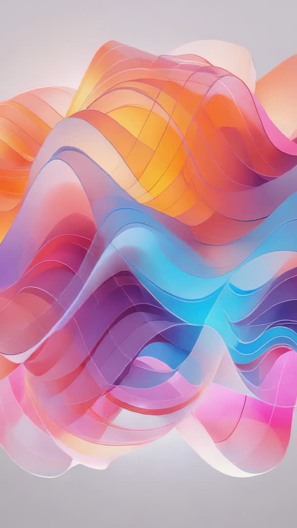 AI Generated Video. Vertical looping motion clip showing morphing translucent ribbons in vibrant gradient palette on soft gray backdrop. Smooth layered waves flowing and blending, creating hypnotic seamless loop suitable for brand intros, social media stories, event visuals, website hero sections. Use for background in product reveal videos, title slides, music visualizers, animated wallpaper. Color scheme balancing warm oranges, pinks and cool blues for flexible mood control. Easy to trim for different durations and crop for portrait or landscape orientations. Recommend using gentle crossfade or blend modes for logo or text overlays. Delivering modern artistic motion asset for creative projects and marketing campaigns.