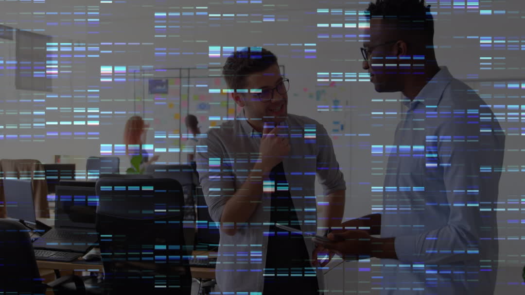 Two diverse male executives are shaking hands and collaborating in a modern office. Blue mosaic squares create a digital interface overlay, emphasizing technology and innovative ideas. Suitable for illustrating themes of business innovation, technological integration, and multicultural teamwork in corporate environments.