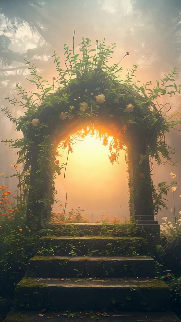 AI Generated Video. Vertical clip showing moss-covered stone steps leading through vine-wrapped archway into glowing misty forest. Warm golden light pouring through arch, creating ethereal halo and soft fog. Lush vines and wildflowers creeping over ancient stone, evoking enchanted garden and portal fantasy. Camera moving upward with gentle dolly, revealing progressive light reveal that works well for dramatic openers. Serving fantasy trailers, meditation and wellness apps, nature documentaries, title sequences, social media reels, background loops for calming visuals, and game cinematics. Designed for portrait delivery and optimized for smartphone reels and stories, compatible with slow motion, color grading, and layered sound design.