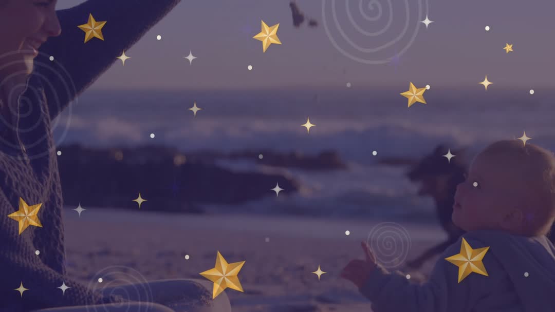 Happy moment featuring mother and child engaging on a sandy beach, enhanced by a whimsical animation of stars and swirls. Suitable for themes of family bonding, summer vacations, joyful childhood memories, and playful interactions. Ideal for social media, family-themed promotions, or animated greetings conveying affection and adventure.