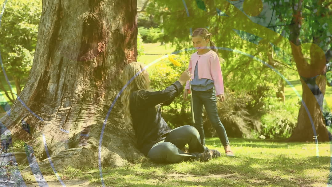 Caucasian mother kneels on grass presenting flowering tree branch to young daughter. Sunny park setting with abstract overlays suggests blend of real and digital worlds. Useful for themes of family bonding, nature exploration, outdoor play experiences, and parental guidance.