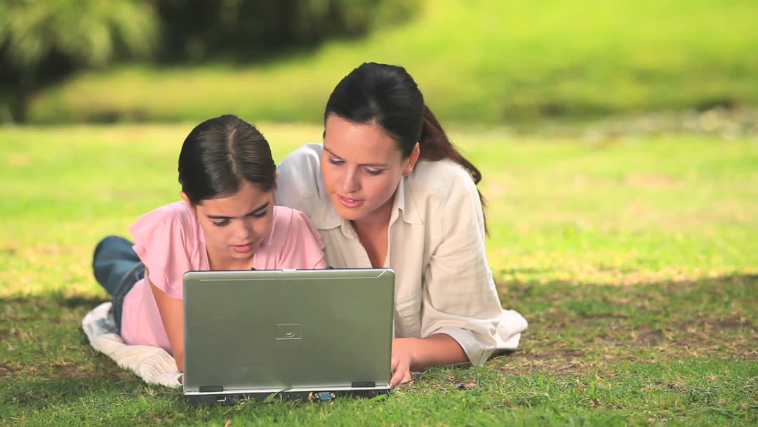 This video showcases a mother and daughter lying on the grass, using a laptop together. The casual and relaxed atmosphere emphasizes family bonding and learning or surfing in a natural setting. Ideal for concepts related to family technology use, outdoor leisure activities, or educational resources, promoting family time and digital learning.