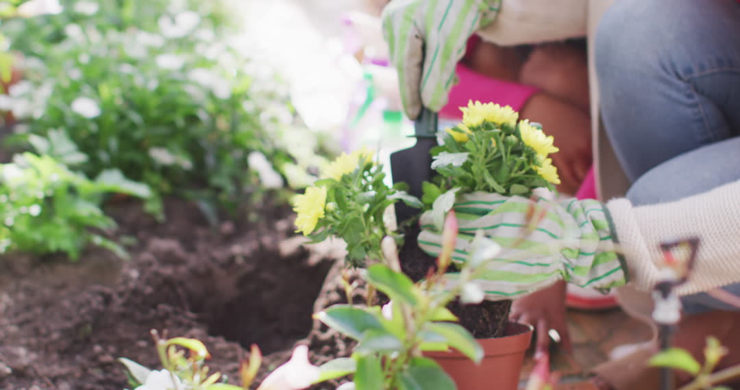 Hands of a mother and daughter planting flowers in a home garden. Both wearing gardening gloves, contributing to creating a vibrant outdoor space. Perfect for concepts inclusivity demonstrations or educating children about horticulture.