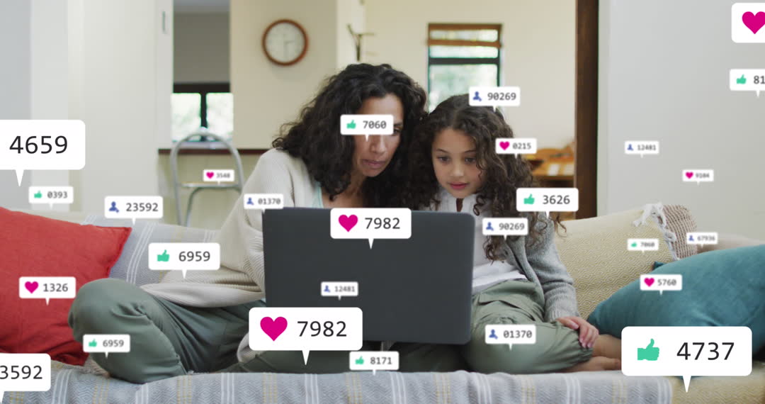 Depicts a mother with her daughter engaging with a laptop from a comfortable living space, with digital social media interaction icons floating around them. This represents online interactions and digital connectivity in family settings. Useful for themes related to social bonding, technology's impact on family life, or digital literacy.