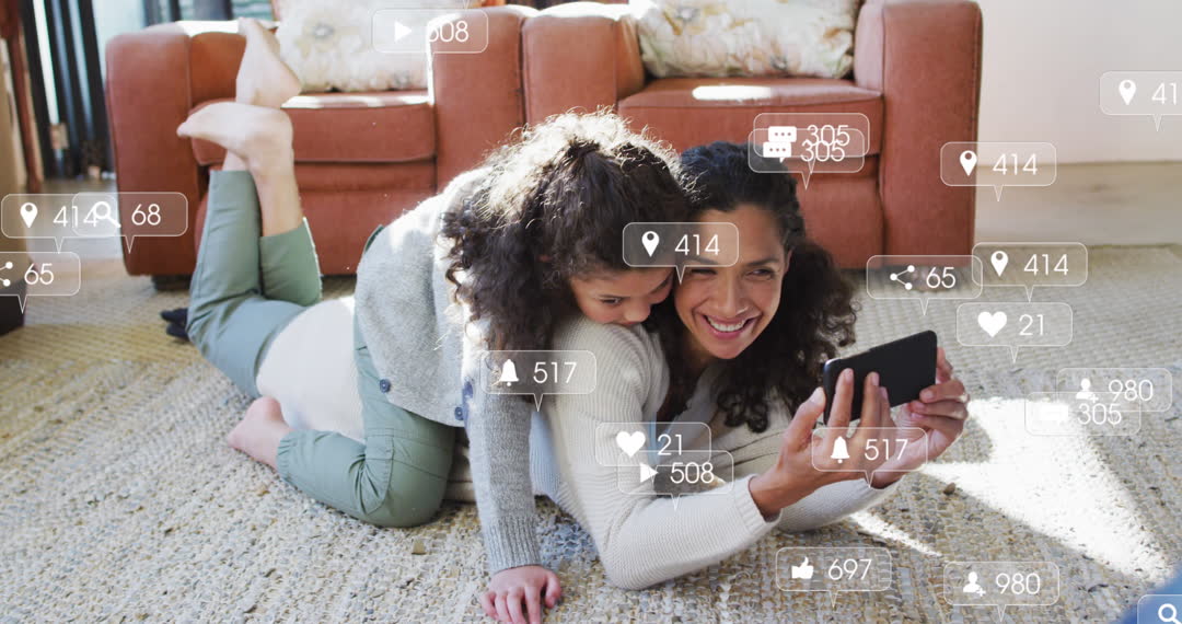 A mother and daughter lying on the carpet in a living room, smiling while looking at a smartphone together. Hearts and notification icons overlay the scene, highlighting their interactive engagement with social media platforms. This visual can be used to illustrate themes of family bond, technology in daily life, digital communication, or trends in social media interactions, applicable for articles or advertisements in family-oriented or tech environments.