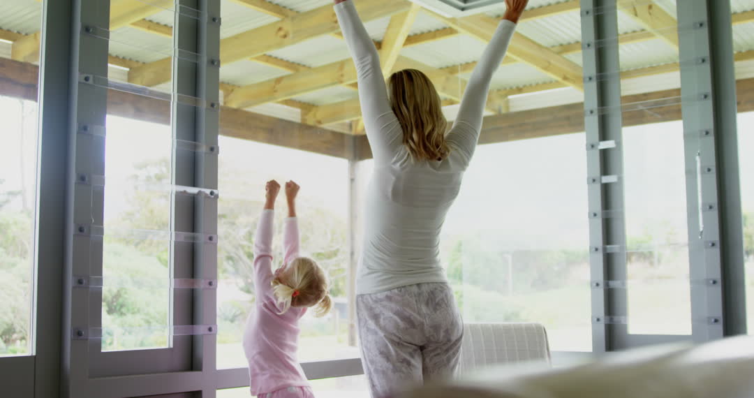 - Mother and Daughter Enjoy Morning Stretch Together at Home