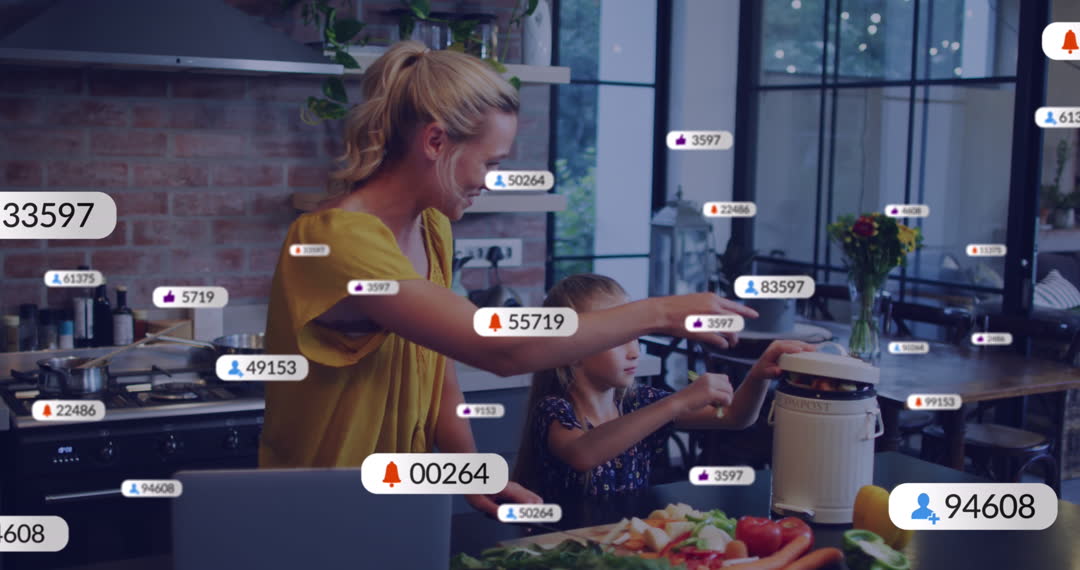 Mother and daughter preparing fresh juice in a sleek, contemporary kitchen environment, layered with digital notifications and icons representing technological connectivity. This dynamic video symbolizes modern family life infused with technology and healthy living. Perfect for use in health and wellness contexts, technology concepts, or family dynamics visuals, showcasing innovation alongside traditional activities.