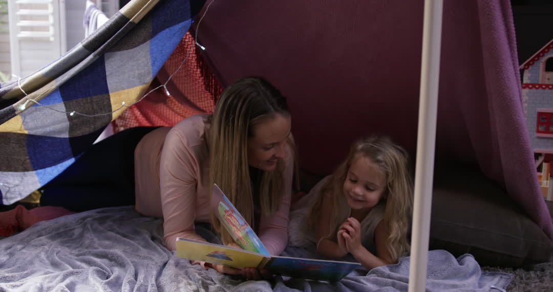 - Mother and Daughter Reading Book in Cozy Blanket Tent