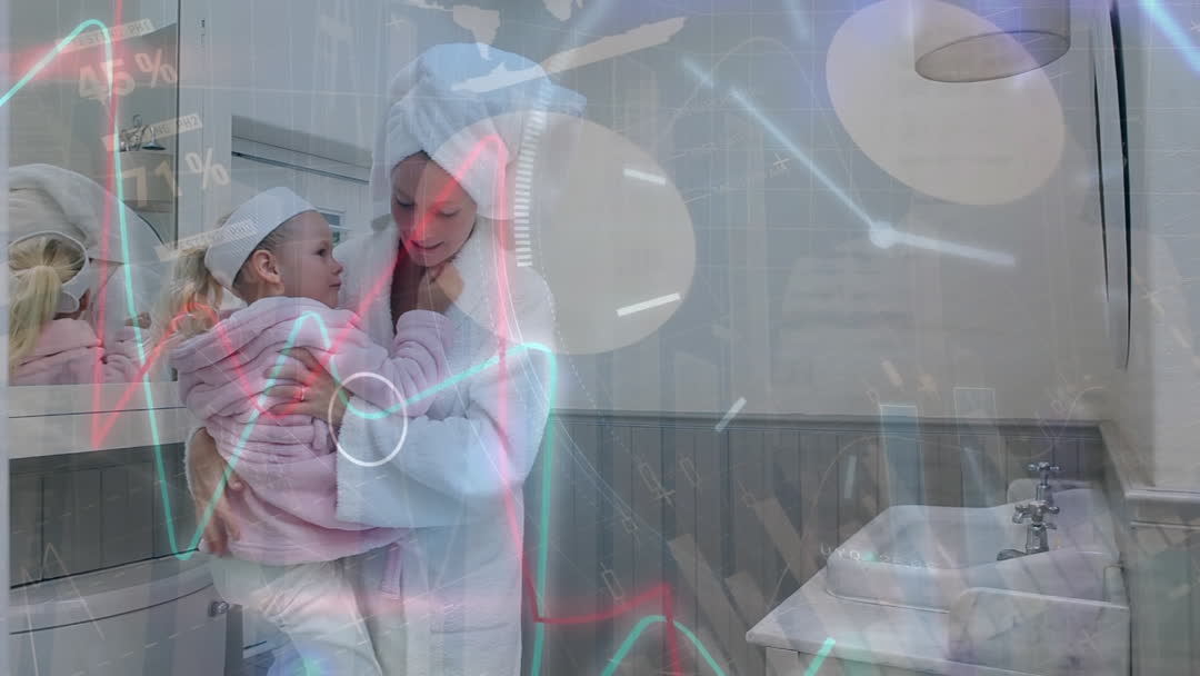 - Mother and Daughter Relaxing at Home in Bathrobes with Finance Graphics Overlay