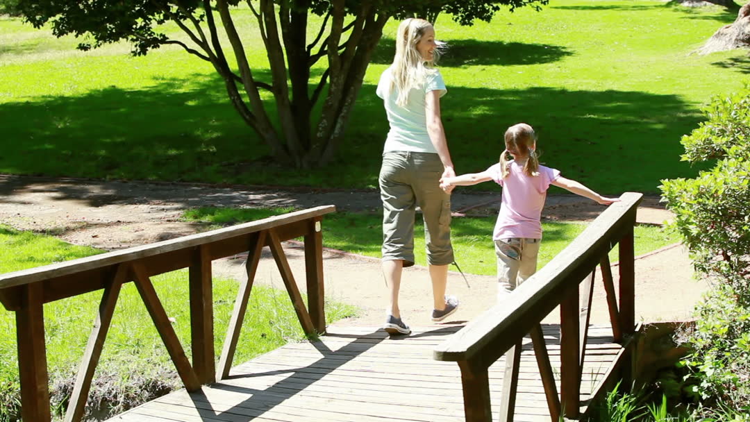 - Mother and Daughter Strolling Across Bridge in Sunny Park