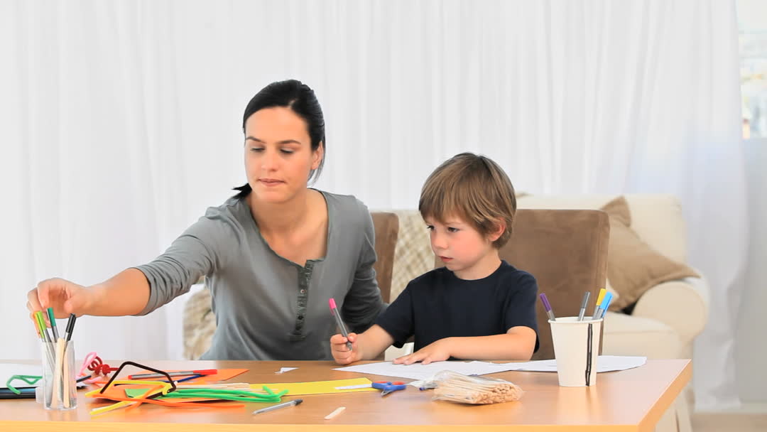 A mother and her young son are sitting together at a table, engaging in drawing and creative artistic projects. The boy appears focused while his mother reaches for stationery supplies. The warm home environment conveys a sense of nurturing and family bonding. Image can be used for topics related to family activities, parent-child relationships, creativity at home, and homeschooling resources.