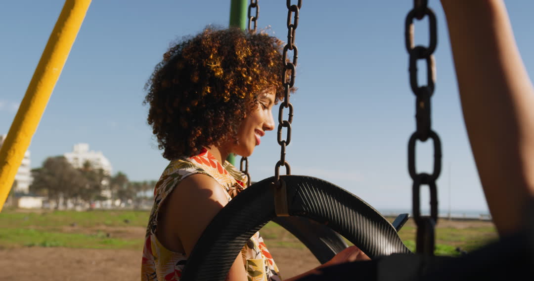 - Mother and Son Playing on Swings in Sunshine
