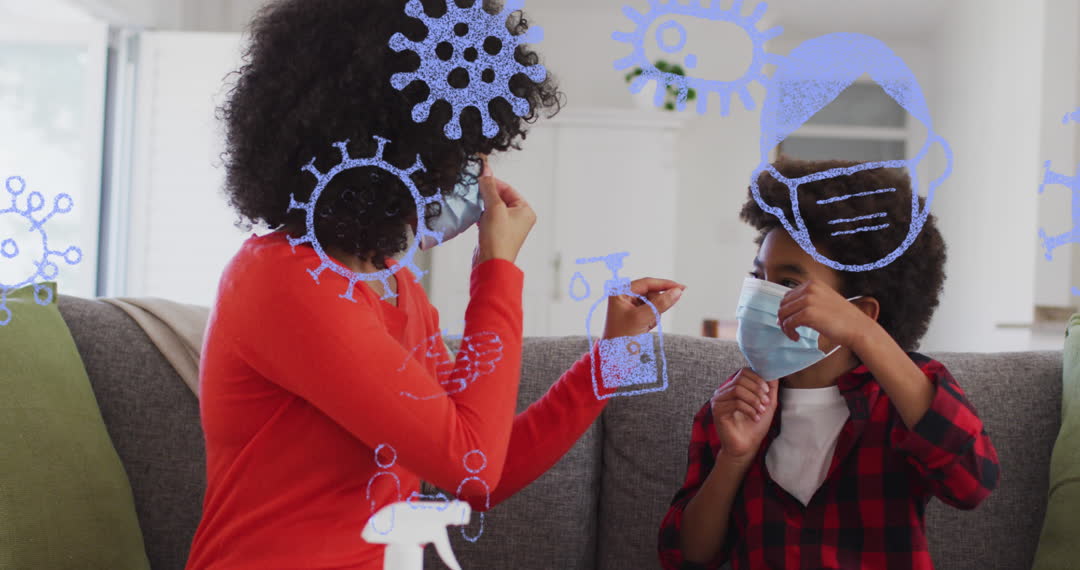 This scene shows an African American mother and her son on a sofa preparing to wear face masks with animated pandemic icons hover over them. The visual presentation symbolizes health consciousness and family safety amidst COVID-19. This video can be used in educational materials related to safety protocols, articles about family health during pandemics, or marketing campaigns promoting health services and hygiene products.