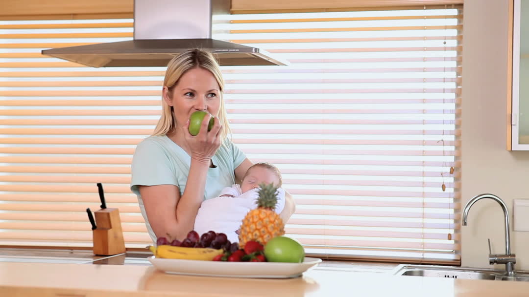 - Mother Enjoying Healthy Snack While Holding Sleeping Baby in Kitchen