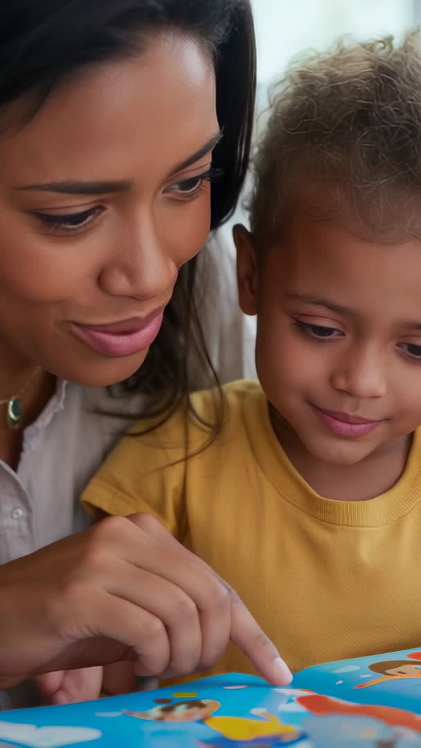 AI Generated Video. Closeup vertical video capturing mother leaning close and reading picture book while pointing at colorful illustrations and child in yellow tee watching and following along. Warm natural light and tight framing highlighting facial expressions, finger pointing, and shared focus on story. Scene conveying gentle guidance, parent child connection, and early literacy moment. Use for parenting blog posts, early childhood education campaigns, preschool or library promotion, pediatric clinic outreach, family lifestyle advertising, social media reels and vertical video ads. Ideal for articles about reading aloud, bonding activities, literacy tips, caregiver resources, and home learning ideas. Suggest caption ideas: 'Reading together, building early literacy' or 'Storytime bonding at home'.