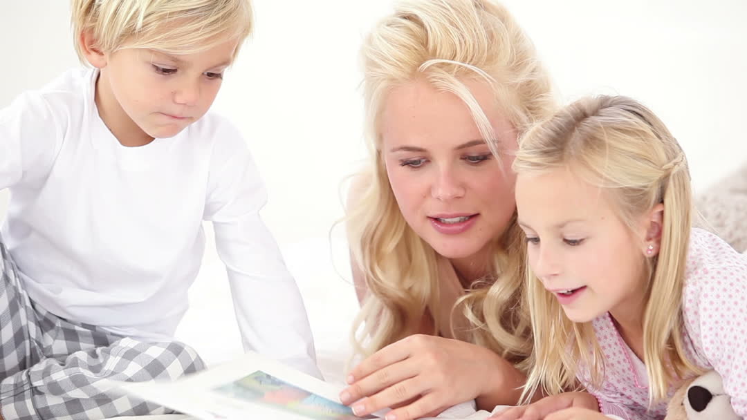 A mother enjoys reading a storybook to her two young children while they relax on the bed in a cozy home atmosphere. The scene highlights family bonding, shared storytelling, and the comfort of home. Ideal for use in family-oriented promotions, parenting articles, or educational material focusing on early learning and literacy.