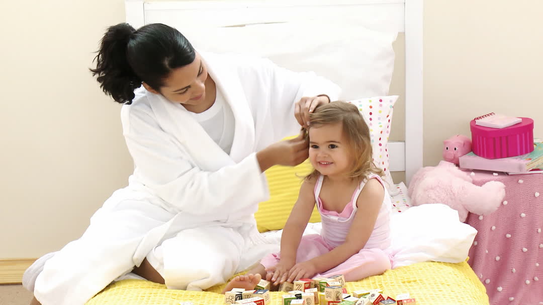 Mother and daughter enjoy playing on bed with colorful blocks, emphasizing learning and bonding. Useful in contexts of parenting, education materials for children, and promoting family time. Highlights interaction and relationship strength within a cozy home setting.