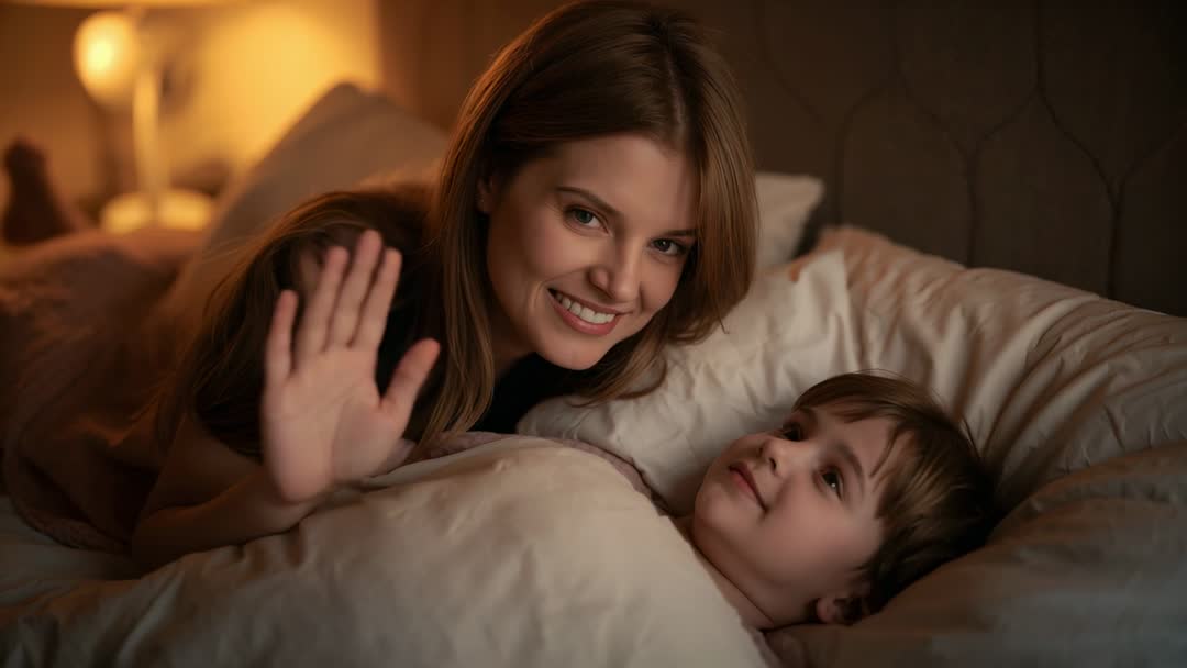 AI Generated Image. Video clip showing mother leaning over son and waving goodnight while child lying comfortably under blanket in softly lit bedroom. Scene capturing warm parent-child bonding, gentle caregiving, and calm nighttime routine with soft lamp glow. Ideal for parenting blogs focusing on bedtime routines and sleep tips, family lifestyle features, pediatric or maternal health content, and advertising for pajamas, bedding, nightlights, or bedroom furnishings. Also useful for social media reels, streaming commercial spots, telehealth or remote family greeting clips demonstrating virtual goodnight messages, and nonprofit campaigns promoting family support and early childhood wellbeing. Creative suggestions: use close-up hero frame, apply warm color grading, add soft ambient music or lullaby, and include text overlays about bedtime tips or family bonding to maximize emotional connection.