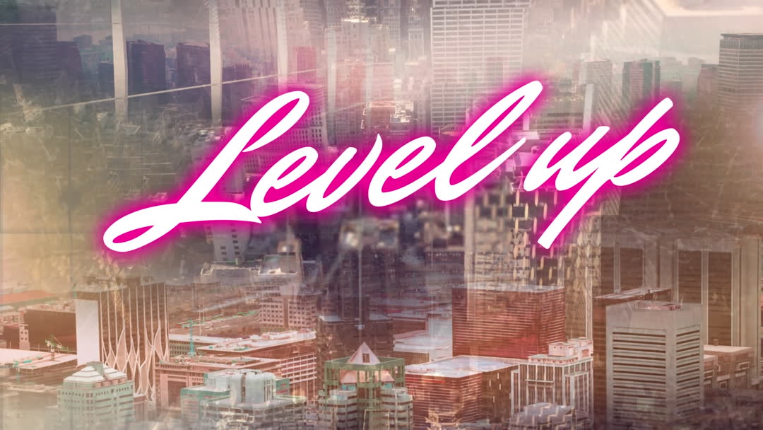 Motivational Level Up Text Overlay on Urban Cityscape Video
