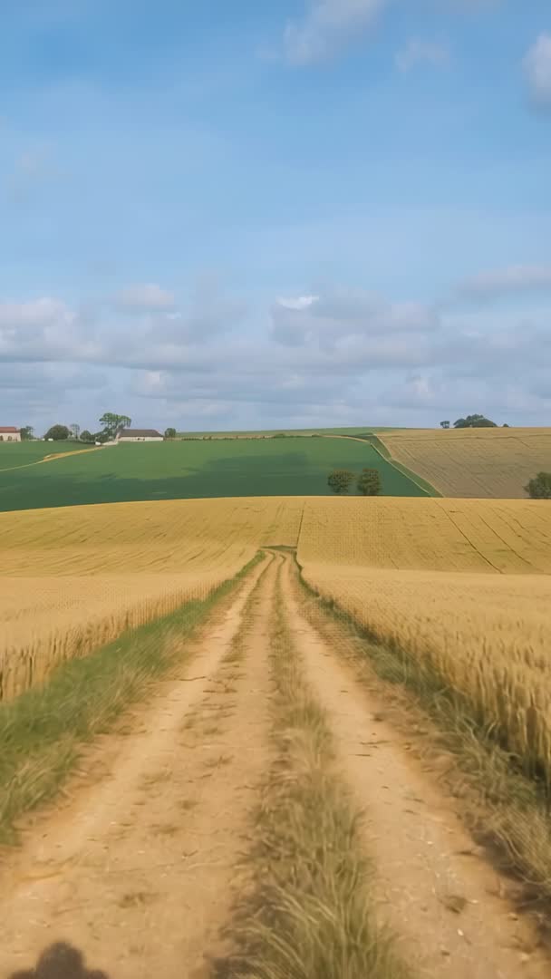 AI Generated Video. Start with camera shadow moving along dirt lane through golden wheat fields toward distant farm buildings under wide blue sky with scattered clouds. Warm summer light casting long shadows and highlighting neat crop rows. Shot conveying calm rural life, harvest season, and open-space freedom. Vertical composition optimized for mobile and social platforms, providing immersive tall-frame view for reels and stories. Useful for social media reels, vertical ads, travel and agribusiness promos, editorial pieces about farming, seasonal storytelling, and background video for websites and presentations. Clip working well as hero footage for agriculture brands, farm-to-table campaigns, crop insurance and equipment commercials, and mindfulness or slow-TV content. Providing ample room for text overlays, logo placement, voiceover, and slow zoom or parallax edits.