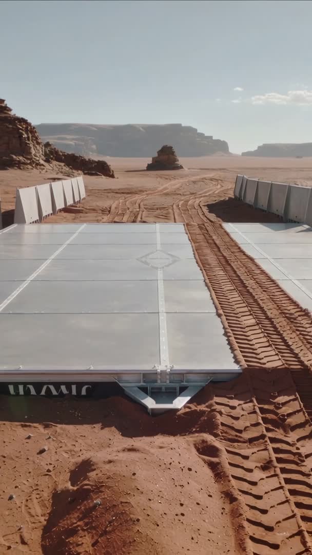 AI Generated Image. Showing vertical camera tracking along red-sand lane, framing modular metal panels and deep tire tracks leading toward distant sandstone mesa under clear blue sky. Foreground featuring low-profile platform and barriers, midground revealing vehicle tracks carving soft sand, background exposing layered mesas and open horizon. Lighting delivering warm red-orange sand tones and cool metallic highlights on panels, creating cinematic contrast and strong leading lines. Working well as establishing shot for desert exploration, off-road vehicle reels, industrial transport sequences, or futuristic film openers. Serving as vertical hero background for mobile ads, social media reels, product showcases, and travel or adventure campaigns. Supporting architecture and engineering presentations, environmental storytelling, and location scouting reels. Editing suggestions: Using slow push-in or parallax movement to emphasize depth, adding ambient electronic or cinematic underscore to build tension, applying warm color grade while preserving sky blues, and creating seamless loop for continuous background. Format optimized for 9:16 vertical workflows and social vertical platforms.