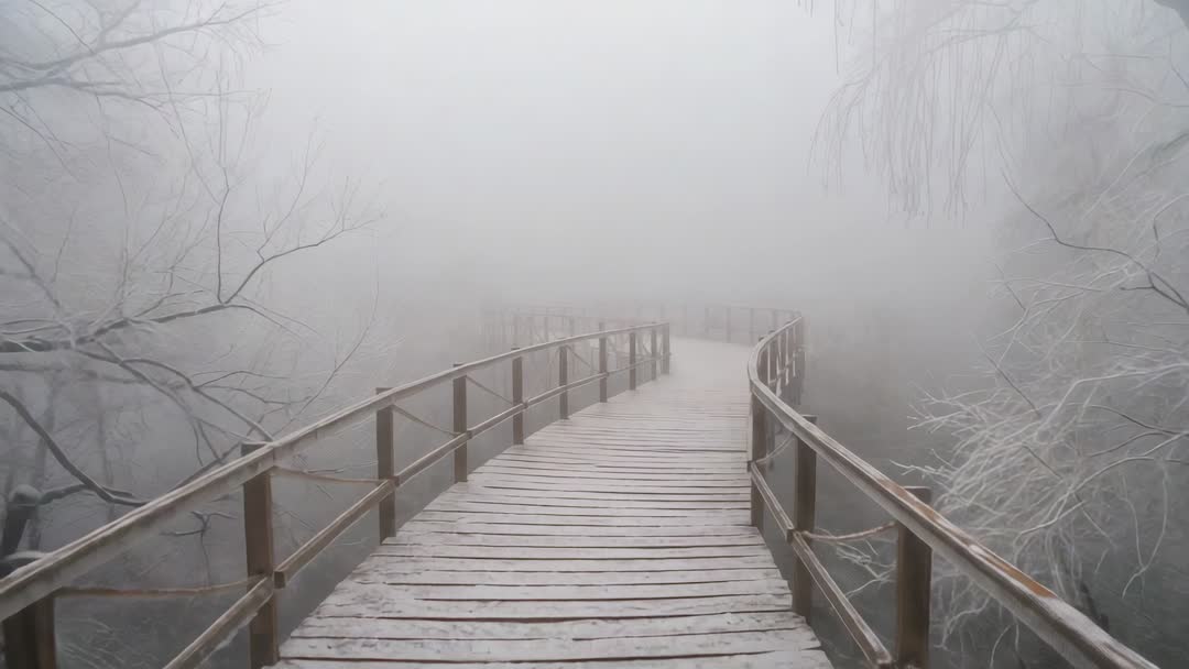 AI Generated Video. Showing slow-moving camera advancing along frosted wooden boardwalk curving across misty marsh and vanishing into dense morning fog. Muted color palette and soft diffused light creating quiet, contemplative mood. Curved leading lines and worn planks providing strong sense of depth and forward motion. Single-frame capture from slow tracking shot offering cinematic movement and subtle tension. Ideal for cinematic opener, travel film, nature documentary, meditation video, or atmospheric title sequence. Working well as background for website hero banners, book covers, social media headers, and seasonal marketing for winter events. Useful for conveying themes of solitude, mystery, transition, or journey. Pairing suggestions: ambient soundscape or minimal piano for emotional tone, cool desaturation or gentle teal grading for moody look.