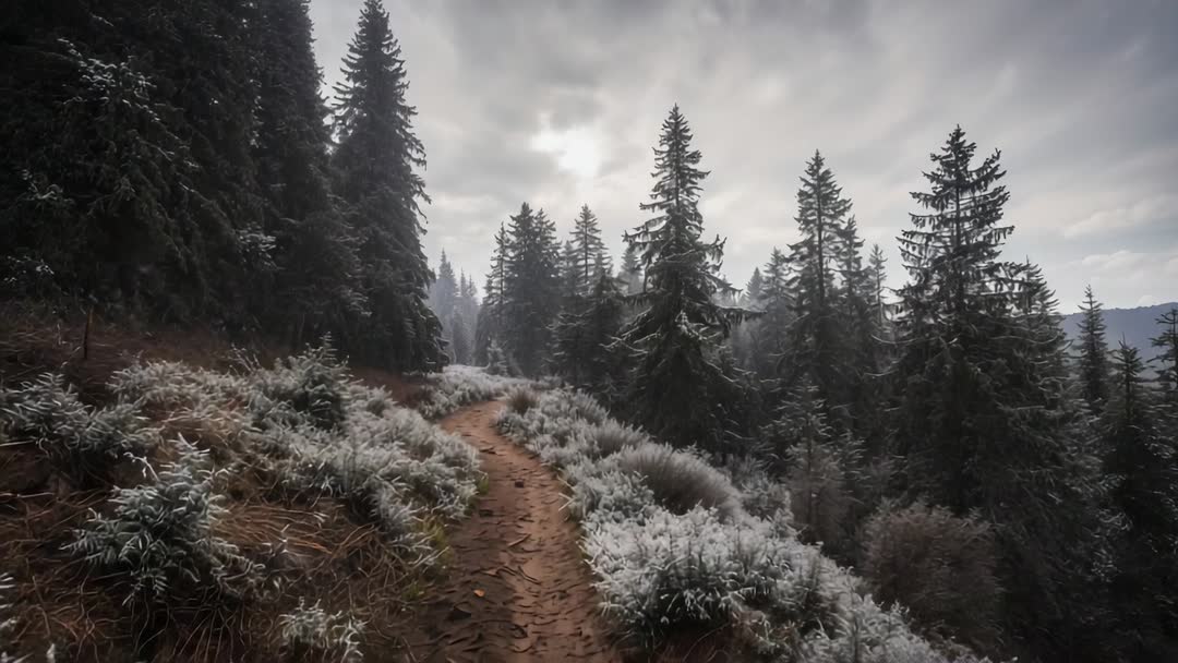 AI Generated Video. Camera moving along winding dirt trail, revealing frost-laced shrubs and towering fir trees under overcast sky. Composition emphasizing foreground texture and leading path, while distant ridge and misty treeline create depth and moody atmosphere. Use for opening sequence in outdoor documentary, travel promo, hiking app demo, tourism marketing, or nature blog hero banner. Pair with slow ambient soundtrack and cool color grade to enhance cinematic mood and seasonal feel. Suitable for stock footage libraries, website backgrounds, social posts, TV spots, environmental storytelling, and guided hike videos.
