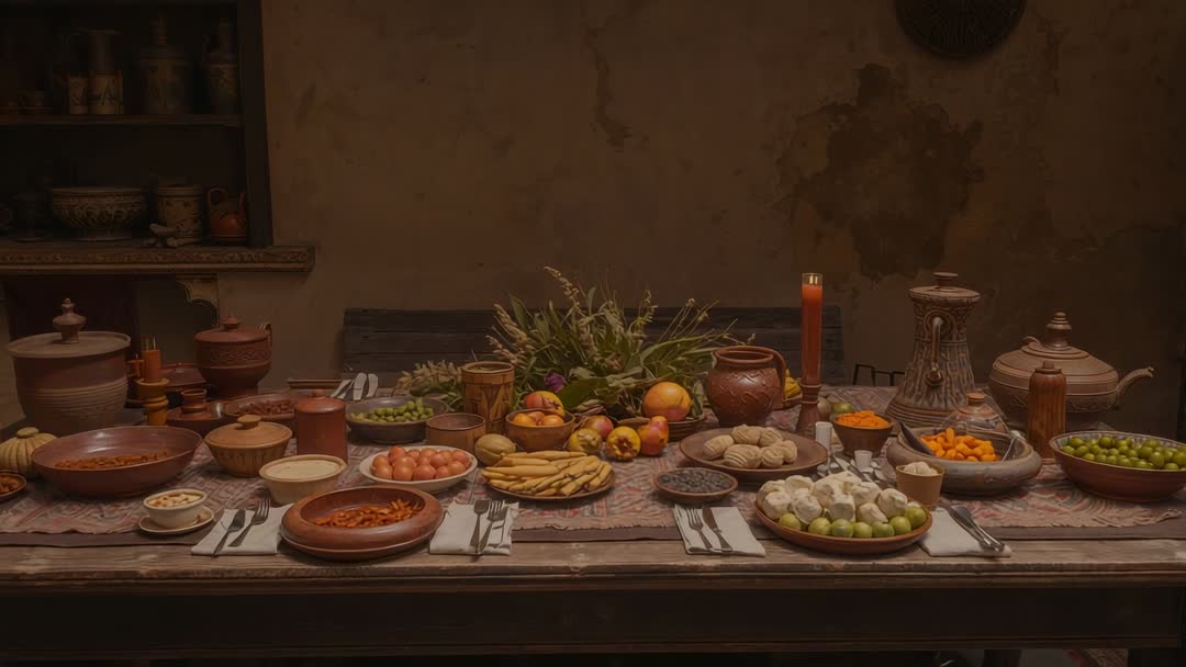 AI Generated Image. Moving camera approaching long wooden table in rustic kitchen, showing abundant fruit cluster, handmade earthenware, and candlelit centerpiece. Warm, earthy tones and textured ceramics creating cozy farmhouse atmosphere. Slow dolly movement and shallow depth of field adding cinematic feel. Footage working well for culinary content, restaurant promo, artisan pottery showcase, cooking show opener, seasonal harvest or lifestyle commercial. Using as hero background for website header, social media reel, food blog hero, product packaging mockup. Suggesting color grading with warm orange highlights and soft shadows, adding subtle film grain for vintage look. Pairing with ambient audio loop of creaking wood and soft candle flicker for immersive stock clip.