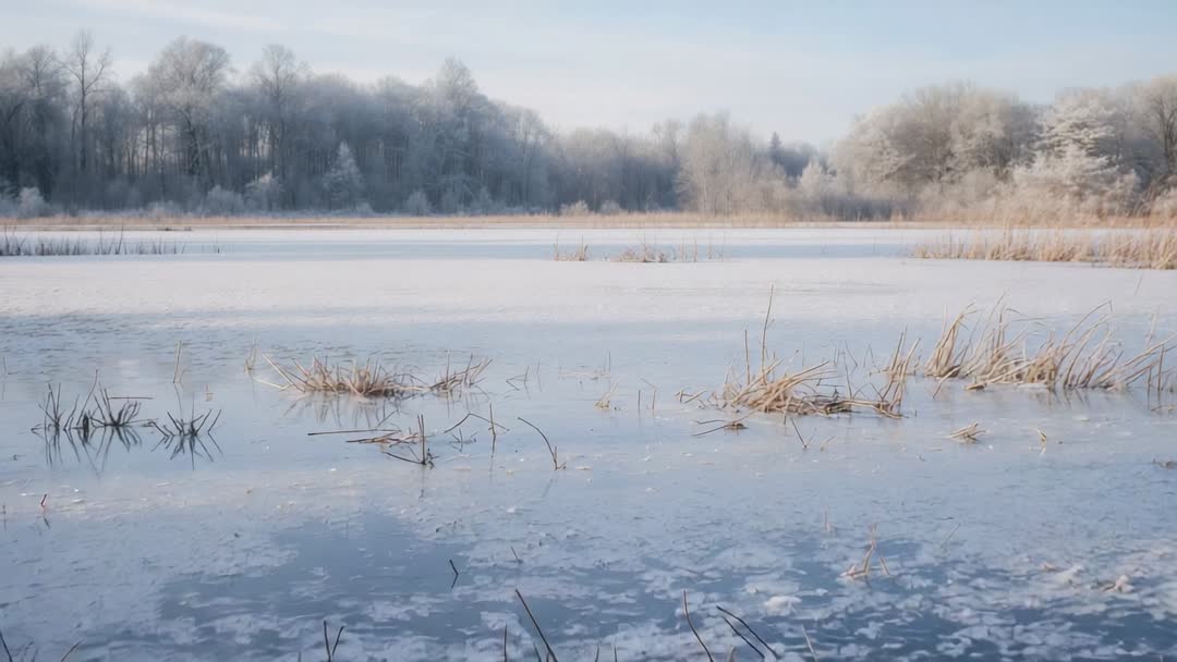 AI Generated Video. Revealing frozen wetland through slow lateral camera movement, bringing frosted reed clusters and icy sheet into close view. Casting pale winter light, bathing scene in soft blue tones while frosted trees form distant backdrop. Emphasizing minimal composition, negative space, and tranquil mood for contemplative visuals. Ideal for winter travel promos, nature documentaries, environmental campaigns, meditation app backgrounds, website hero banners, social media reels, broadcast weather segments, and stock footage libraries. Suggesting editing options: trimming for seamless loop, applying cool-tone color grade, layering ambient wind or soft piano, slowing motion for cinematic feel, and overlaying text or lower thirds for titles. Delivering versatile clip for commercial, editorial, and creative projects needing calm, cold, natural atmosphere.