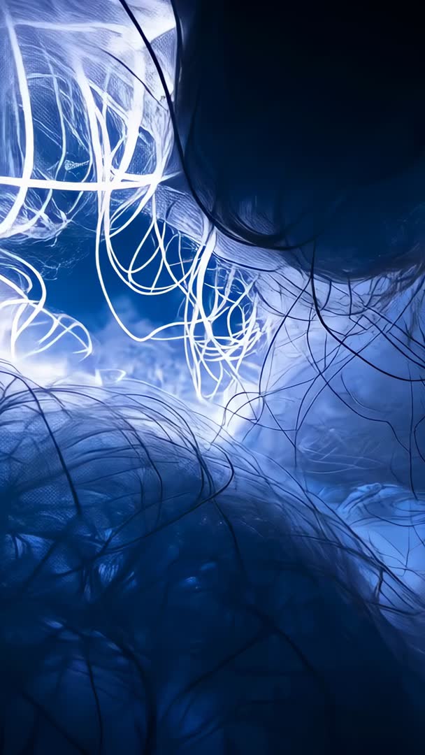 AI Generated Video. Video showing camera moving through tight fiber tunnel and revealing glowing filaments and luminous core. Close macro perspective creating strong sense of depth, texture, and motion with electric blue tones and soft bloom. Featuring delicate thread details and flowing luminescent trails that respond to camera movement. Ideal for technology and science visuals, abstract backgrounds, VJ loops, music visuals, and cinematic title sequences. Working well for social vertical formats such as reels, shorts, stories, and mobile wallpaper. Loop-friendly composition allowing seamless repeats for installations, live visuals, and stage backdrops. Delivering high-contrast luminescence suitable for product intros, futuristic ads, UI backgrounds, and experimental art projects.