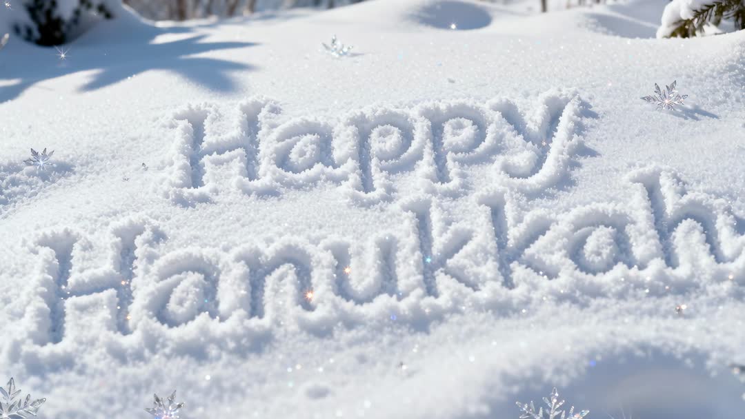 AI Generated Image. Footage showing moving camera revealing Happy Hanukkah letters carved into fresh snow in sunlit evergreen clearing. Snow edges forming fluffy ridges while sunlight causing crystal sparkle and soft bokeh for warm winter mood. Camera performing slow cinematic reveal with shallow depth of field, offering gentle motion perfect for smooth transitions and title sequences. Use for Hanukkah greeting clips, holiday social media posts, seasonal email headers, festival promotions, synagogue event trailers, and winter travel marketing. Frame allowing easy text or logo overlay, color grading flexibility, and mixing with animated menorah or candle elements for custom greetings.