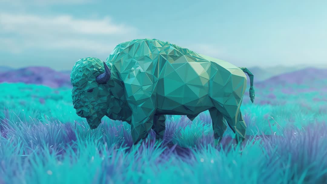 AI Generated Image. Moving camera revealing low-poly bison grazing on teal purple grassland, highlighting faceted polygonal surfaces, angular silhouette, and shallow depth of field. Scene featuring gentle dolly approach, subtle rim lighting, and pastel color grading for surreal, cinematic mood. Render offering loopable mid-shot with ample crop space for overlays and titles. Usage ideas: Using as hero background for creative agency websites, music video intros, and tech product promos; Adding atmospheric loop to social media ads, VJ visuals, or event projections; Pairing with bold typography for poster art, title sequences, and brand idents; Illustrating 3D modeling tutorials, polygonal art editorials, and AI-generated art features; Incorporating into game trailers or concept reels to convey stylized nature and futuristic aesthetic. Technical notes: Delivering high-resolution render suitable for color grading, overlay effects, speed ramping, and cropping to multiple aspect ratios.