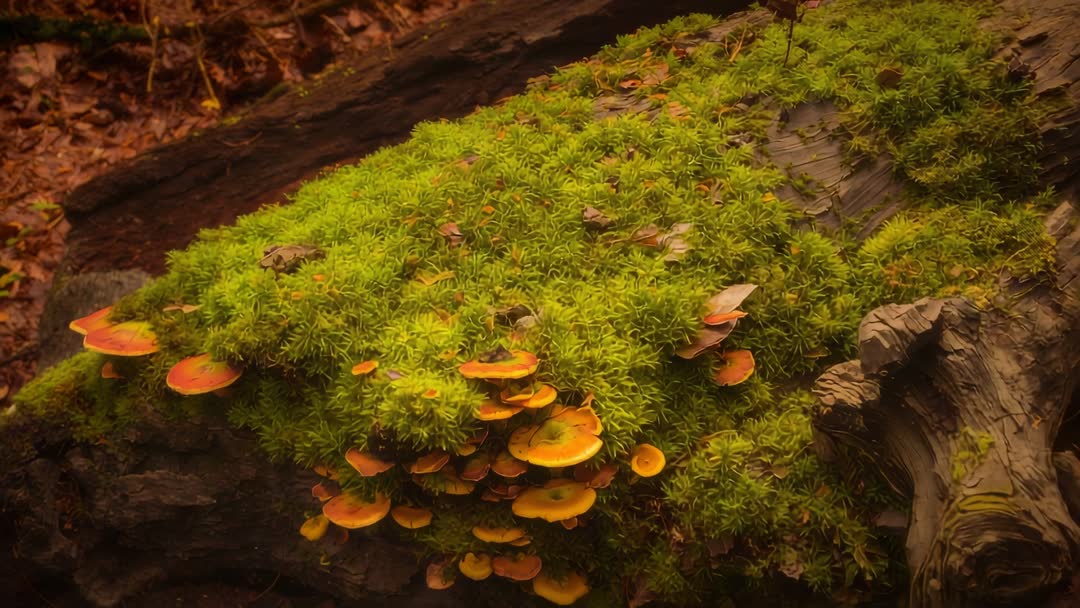 AI Generated Image. Footage showing close-up moss mat and orange bracket fungi on decaying log. Slow camera pan revealing rich texture, color contrast, and damp woodland atmosphere. Serving nature documentaries, environmental education, mycology tutorials, website backgrounds, social media reels, meditation videos, seasonal autumn promotions, eco tourism marketing. Working well as loopable background or B-roll insert for scenes about forest ecology, decomposition, biodiversity. Offering warm green and orange palette, soft low-light mood, and strong textural detail for titles or overlay graphics.
