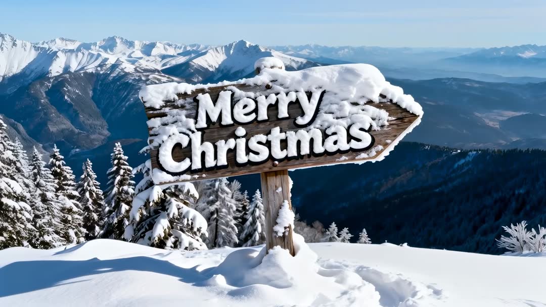AI Generated Video. Video clip featuring moving camera pushing in on rustic wooden Merry Christmas sign perched on snow-covered alpine ridge, revealing panoramic mountain range and frosted pine forest. Scene offering cinematic foreground detail and wide open sky area for text overlay, making clip ideal for holiday greetings and promotional openers. Recommended uses include holiday commercials, greeting card animations, website hero banners, social media reels, travel and winter tourism campaigns, TV openers. Post-production tips: applying warm highlight grading and cool shadow tones for contrast, adding subtle camera shake or parallax for dynamic feeling, leaving safe space in upper third for headline or logo. Clip offering wide aspect ratios suitable for widescreen and social formats.