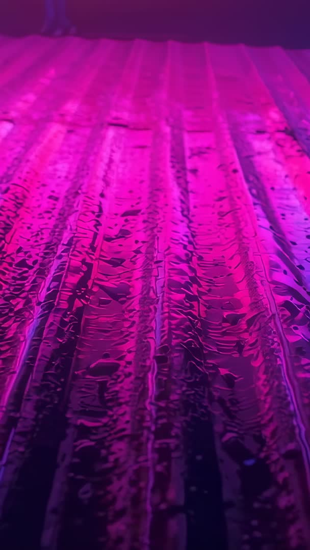AI Generated Image. Showing moving camera revealing wet corrugated metal roof panels glowing with magenta and purple water reflections. Featuring close up ridged metallic sheet, glossy surface, and scattered droplets creating rich abstract texture and dynamic light patterns. Working well as music video background, nightclub or concert visual, fashion or tech promo, social media vertical ad, and cinematic title sequence. Providing modern industrial aesthetic for motion graphics overlays, VJ loops, album art, and editorial spreads that require neon color palette and tactile metallic detail.