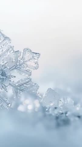 AI Generated Video. Video showing moving camera right across macro snowflake and ice crystals, revealing hexagonal facets, water droplets and soft bokeh highlights. Closeup detail creating calm, frosty mood with cool blue tones and shallow depth of field. Ideal for winter and holiday advertising, seasonal social media reels, smartphone wallpapers, product overlays and website hero banners. Vertical format fitting mobile-first campaigns and stories. Suggest pairing with subtle ambient music, slow motion, or gentle text overlays to enhance elegant crystalline feel.