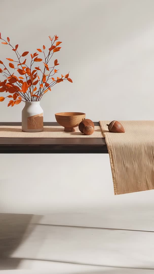 AI Generated Image. Vertical video showing camera gliding across shelf, shifting light and casting soft shadows over two-toned ceramic vase, terracotta bowl, wooden pods, and pleated textile runner. Composition highlighting contrast between warm orange foliage and neutral backdrop, creating calming seasonal mood. Use for social media reels, interior design blogs, product lifestyle videos, seasonal marketing campaigns, fall catalogues, home decor websites, and mindfulness or wellness promos. Creative suggestions: add minimal text overlay and slow ambient music, create seamless loop for background motion, crop for mobile hero banners or story format, pair with typography for catalog or ad layouts. Styling emphasis on natural materials, warm tones, and simple geometry, supporting branding for artisanal ceramics, handcrafted goods, slow living, and seasonal editorial.