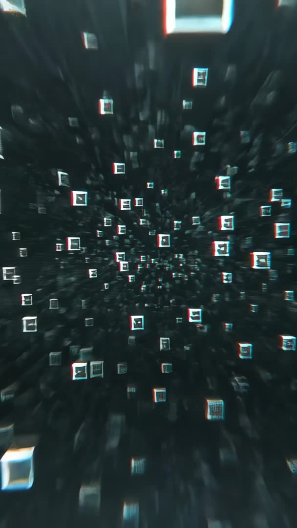 AI Generated Image. Showing moving camera traveling through dark grid of glowing voxels and floating frames, creating intense sense of depth and forward motion. Featuring cyan and magenta neon highlights with subtle chromatic aberration and glitch accents, producing cyberpunk atmosphere. Designed for vertical video playback, optimized for mobile screens and social stories. Suited for tech product promos, app intros, UI mockups, streaming overlays, music visuals, VJ loops, title sequences and sci-fi openers. Allowing easy looping and color grading for brand integration and montage work. Supplying high-contrast cinematic look for marketing, presentations, and motion design projects.