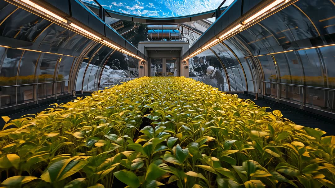 AI Generated Image. Video clip showing moving camera traveling through orbital greenhouse module, featuring long central seedling tray filling frame and helmeted technician inspecting crops against reflective curved walls and overhead LED lighting. Earth view through upper dome adding sense of altitude and context. Ideal for illustrating space agriculture concepts, supporting research footage for controlled environment agriculture, enhancing sci-fi film sequences, powering corporate sustainability presentations, and enriching educational content about hydroponics and crop production in microgravity. Editing suggestions: pairing with slow ambient soundtrack, using cinematic color grade, cutting to close-ups of seedlings for sequence transitions. Suitable for marketing campaigns, documentary narratives, TV broadcast, virtual reality experiences, and museum exhibits.