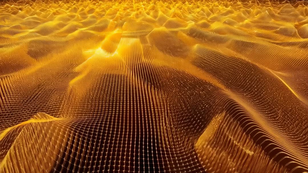 AI Generated Image. Video showing sweeping camera movement across pulsing golden mesh, central glow intensifying while ripples radiating outward across grid. Foreground featuring high-detail 3D mesh with undulating waves, background fading into soft amber horizon, creating holographic data landscape. Visuals blending organic dune-like forms and precise wireframe grid, producing futuristic, immersive atmosphere. Ideal for tech and finance projects, branding intros, data visualization, broadcast openers, website hero loops, social media ads, stage visuals, VJ loops. Editing tips: looping-friendly composition, suggesting slow zoom or parallax to increase depth, color grading toward teal or deep blue for contrast, adding subtle particle overlays and tempo-synced cuts for rhythm.