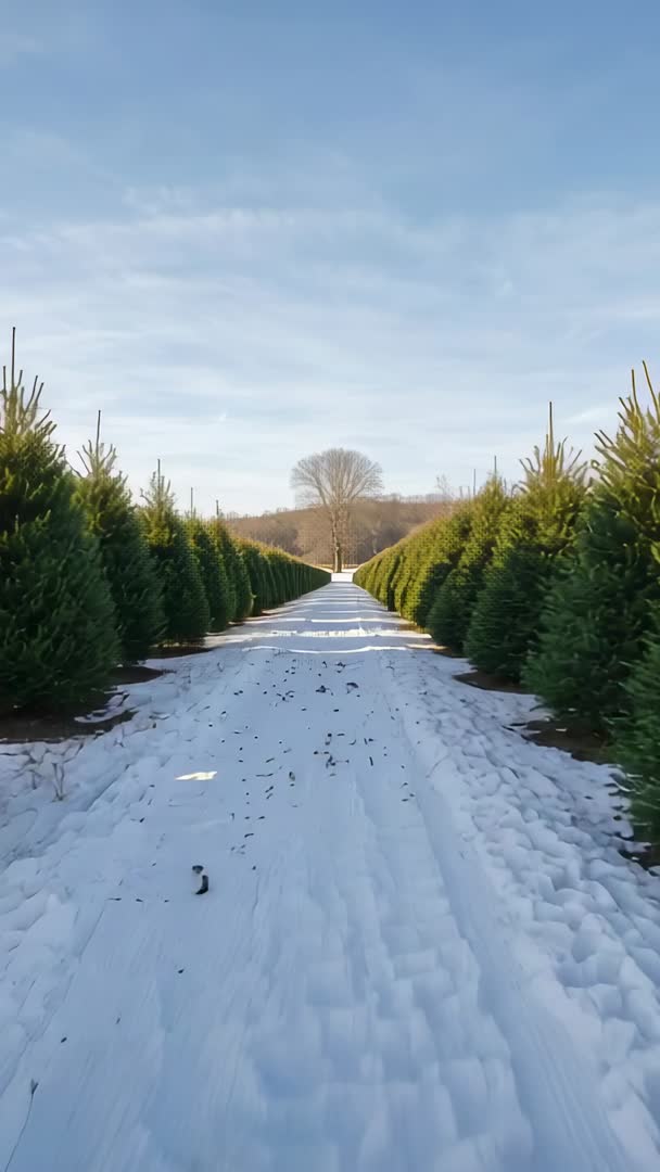AI Generated Image. Moving camera along snowy path between symmetrical rows of evergreen trees, creating strong leading lines toward distant solitary tree under clear blue sky. Showing scattered pine needles on snow and textured tire tracks, adding authentic farm atmosphere. Serving as vertical B-roll for holiday marketing, Christmas promotions, seasonal social media reels, website hero headers, travel reels, nature or agriculture stories. Working well with text overlays, slow ambient music, logo reveal, or voiceover narration for storytelling. Leaving ample negative space at top for title or branding placement.