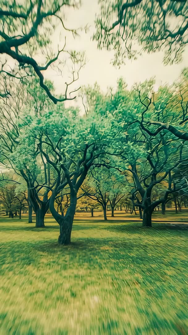 AI Generated Image. Vertical footage showing camera moving forward through twisting tree grove, highlighting textured bark, contorted branches and dappled canopy light. Motion blur adding sense of forward motion and gentle pace while foreground grasses streak past. Color palette emphasizing deep greens and warm earth tones, creating calming and organic mood. Footage suiting meditation and mindfulness apps, social media vertical reels, eco tourism promos, landscape architecture presentations, nature documentary openers, and wellness or corporate retreat videos. Clip providing seamless loop potential for ambient backgrounds and screensavers. Shooting note: smooth forward dolly or gimbal movement helping maintain immersive perspective and bark detail.