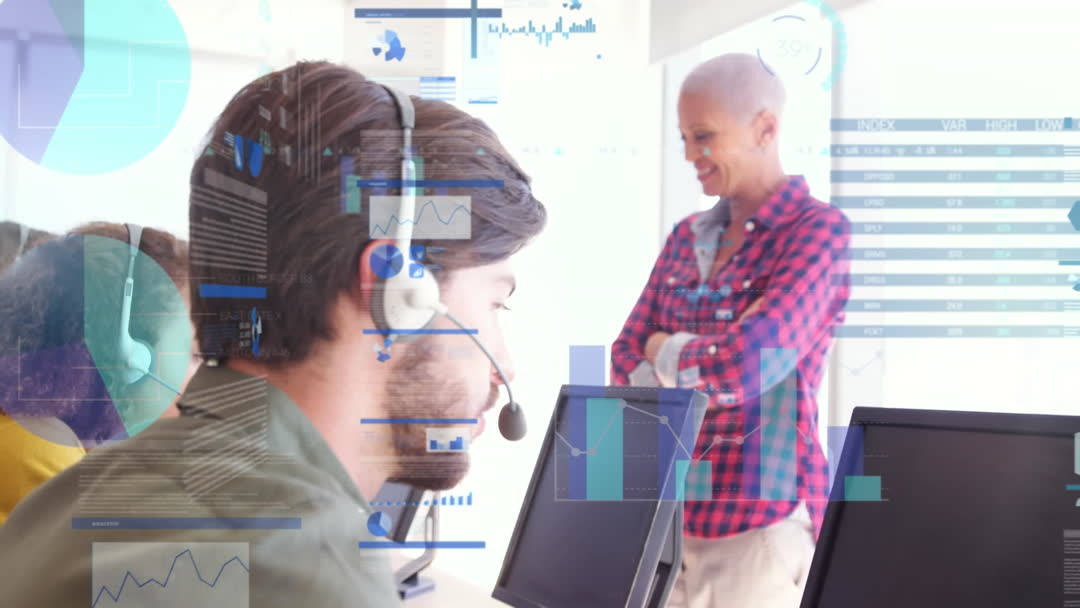 Innovative video showcasing diverse business professionals collaborating in an office environment with overlaid financial data graphs and charts. Ideal for use in materials focusing on teamwork, financial analysis, data-driven strategies, global business culture, technology integration in finance, and modern office environments.